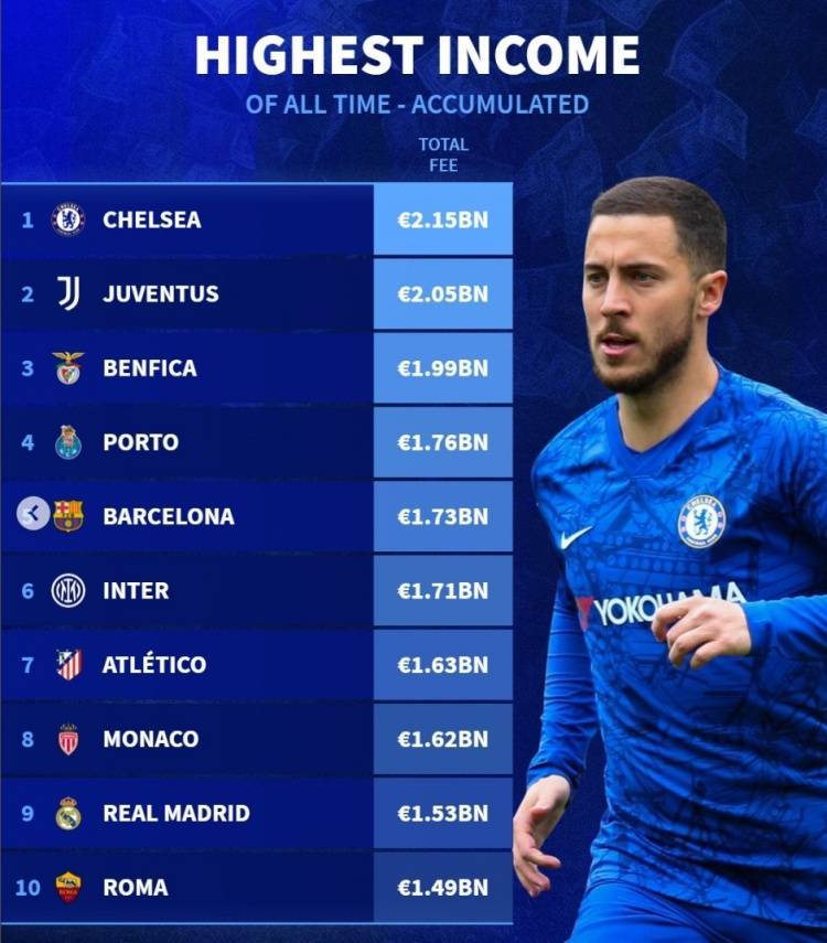 直播吧7月25日讯 《转会市场》统计了各队历史转会费总收入情况,切尔西压尤文居首。